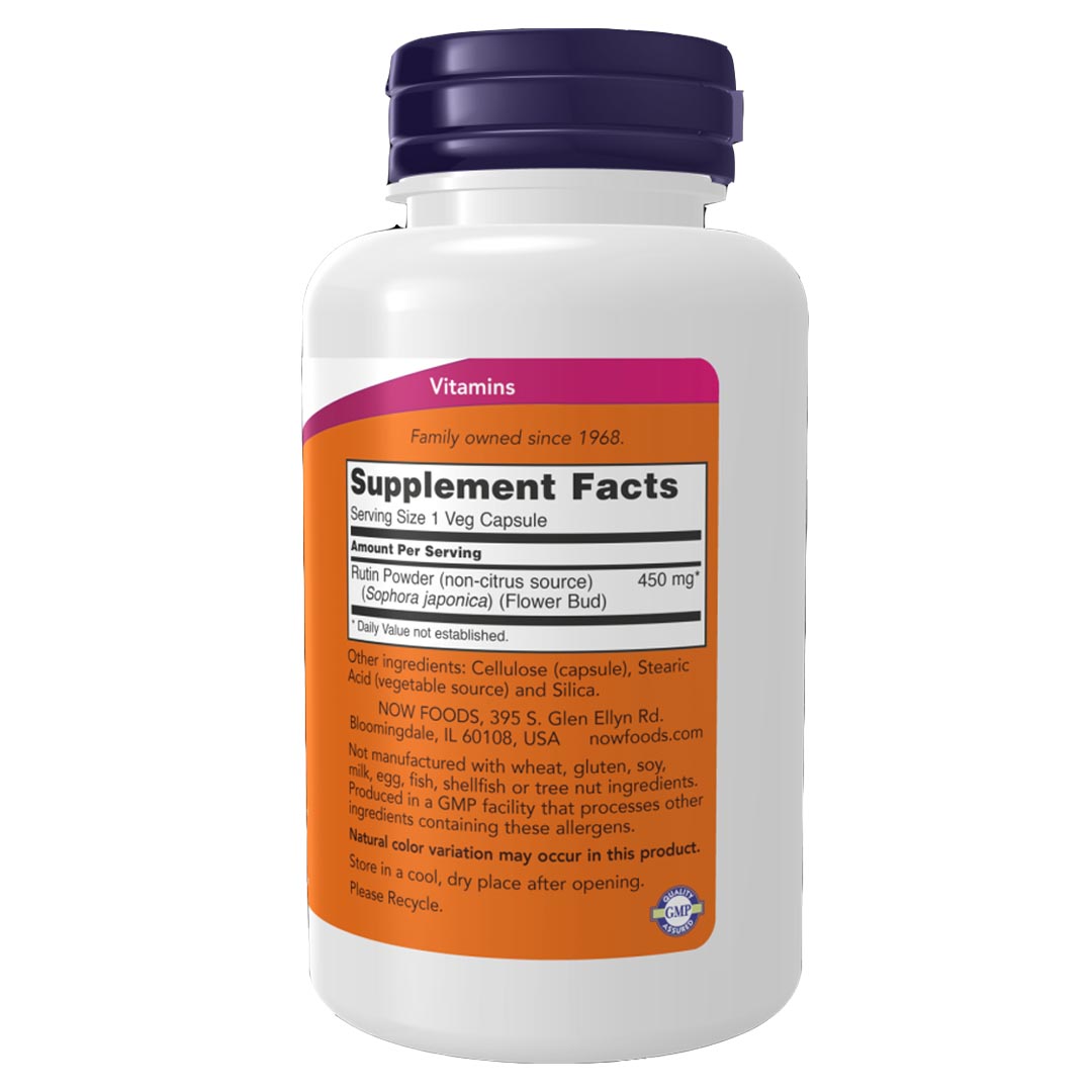 Rutin is a bioflavonoid related to quercetin and hesperidin found in both citrus and non-citrus fruits, as well as other foods such as buckwheat. Rutin is a powerful combatant of free radicals and is best known for its role in vascular health. Rutin helps to maintain the structural integrity of blood vessels, such as veins and capillaries. Scientific studies suggest that it may help to support vascular function and promote healthy circulation. NOW Rutin is vegetarian and derived from a non-citrus source.