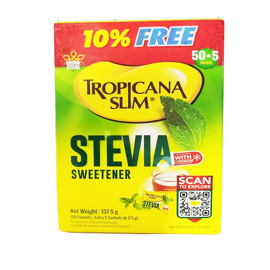 Sweeten your hot and cold beverages with Tropicana Slim Stevia Sweetener with Chromium and enjoy the sugar-like and no bitter after taste. It is also suitable for cooking and baking.