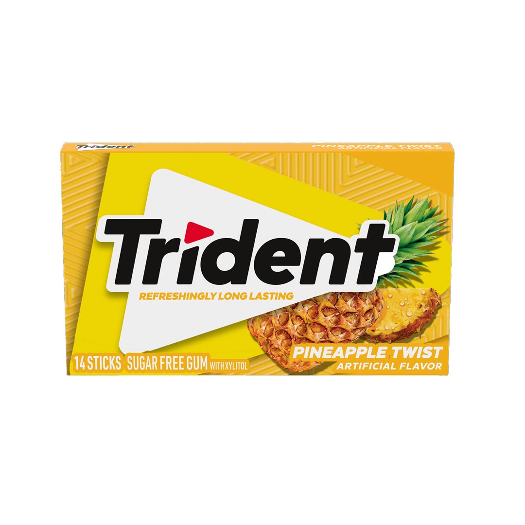 Trident Pineapple Twist Sugar Free Gum is a fruity and delicious way to freshen breath and protect your teeth. With 30% fewer calories than sugared gum, Trident sugarless gum is sweetened with xylitol. Chewing Trident gum after eating and drinking cleans and protect teeth. Each pack of chewing gum contains 14 individually wrapped sticks.